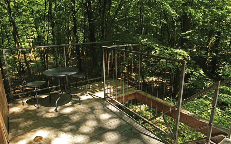 Tout de bois et de verre, je suis arrimé à mon magnifique chêne à six mètres du sol.