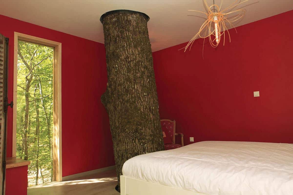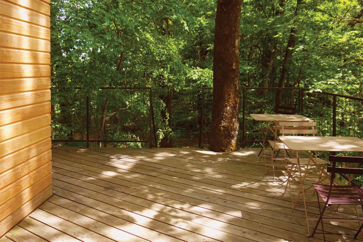 Nous sommes deux cabines imbriquées l’une dans l’autre et solidement arrimées à quatre beaux chênes à quelques encablures du sol.