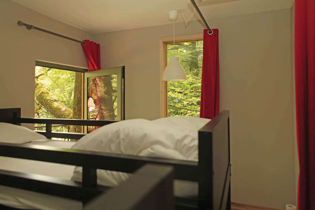 La cabane dans les arbres est pourvue d’une grande terrasse surplombant une mare où barbotent canards et grenouilles. Nos deux cabines sont parfaitement isolées et chauffées en hiver. Notre salle de bain privée ne se trouve qu’à quelques mètres dans une dépendance et nous avons des toilettes sèches à bord. Pour les parents inquiets, une ouverture a été créée entre les deux cabines. Un volet leur redonnera vite leur intimité s’ils le désirent.
