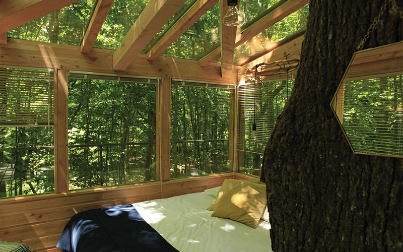 The window panes that surround you are equipped with Venetian blinds. Under my wooden and glazed rooftop, you can admire the top of the tree to which I am suspended. In the morning you will gently wake up with the sun which will lighten your nest little by little through the transparent roof without curtains.