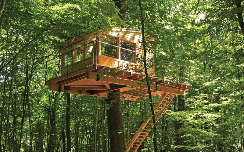 All in wood and glass, I am tied up to my beautiful oak tree six metres above the ground.